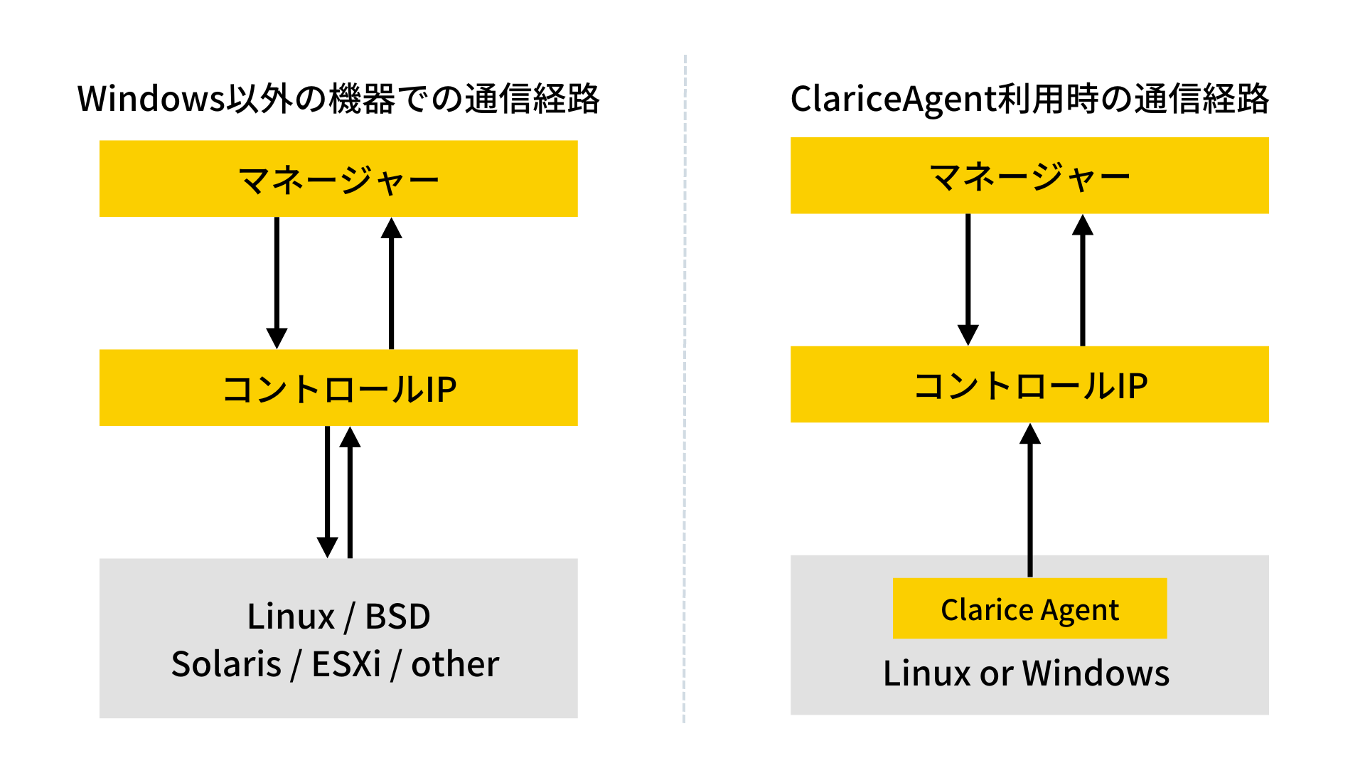 ClariceAgentは、Linux または Windows側からコントロールIPに対して、暗号化された独自プロトコルでの通信を行います。