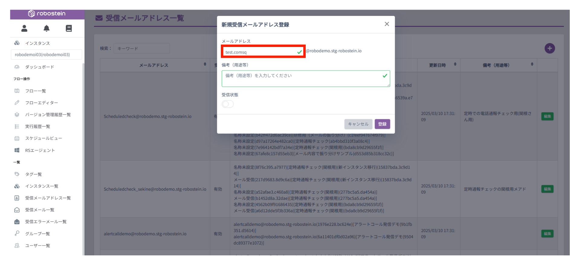 ロボシュタインの管理画面で「受信メールアドレス一覧」にある「+ボタン」をクリックしてください。