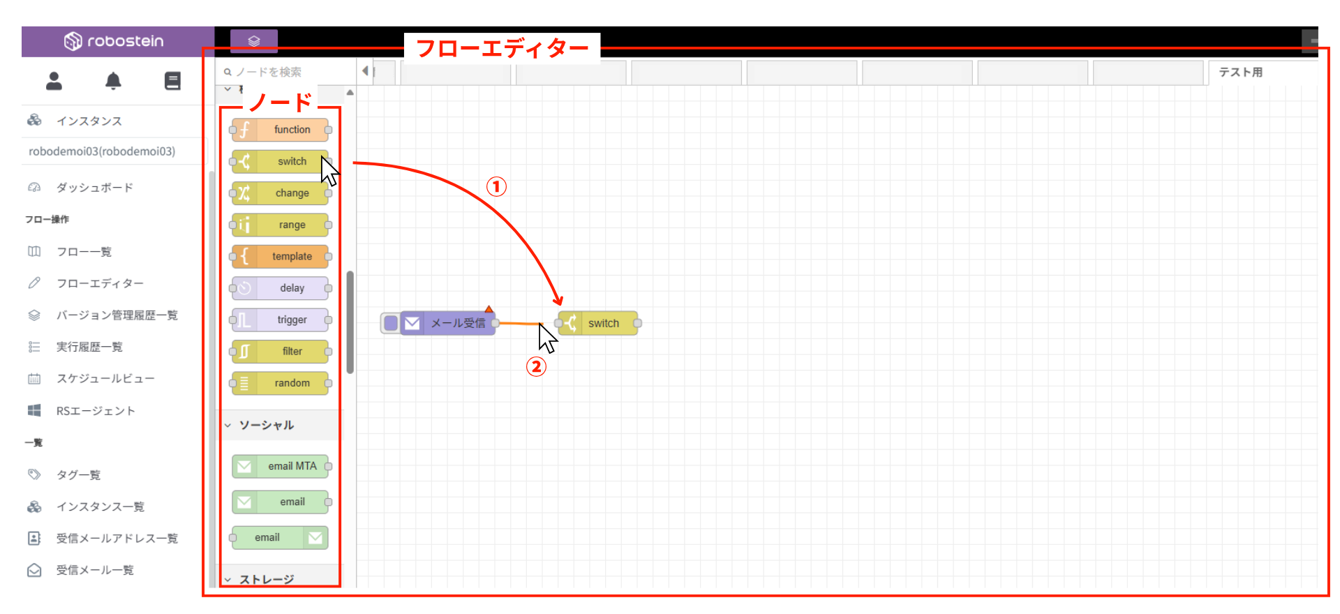 ロボシュタインの画面右側には「フローエディター」と呼ばれるキャンバスがあり、左側のパネルから「ノード」と呼ばれる部分をドラッグ&ドロップで貼り付けていくことで処理の流れを組み立てます。(①)