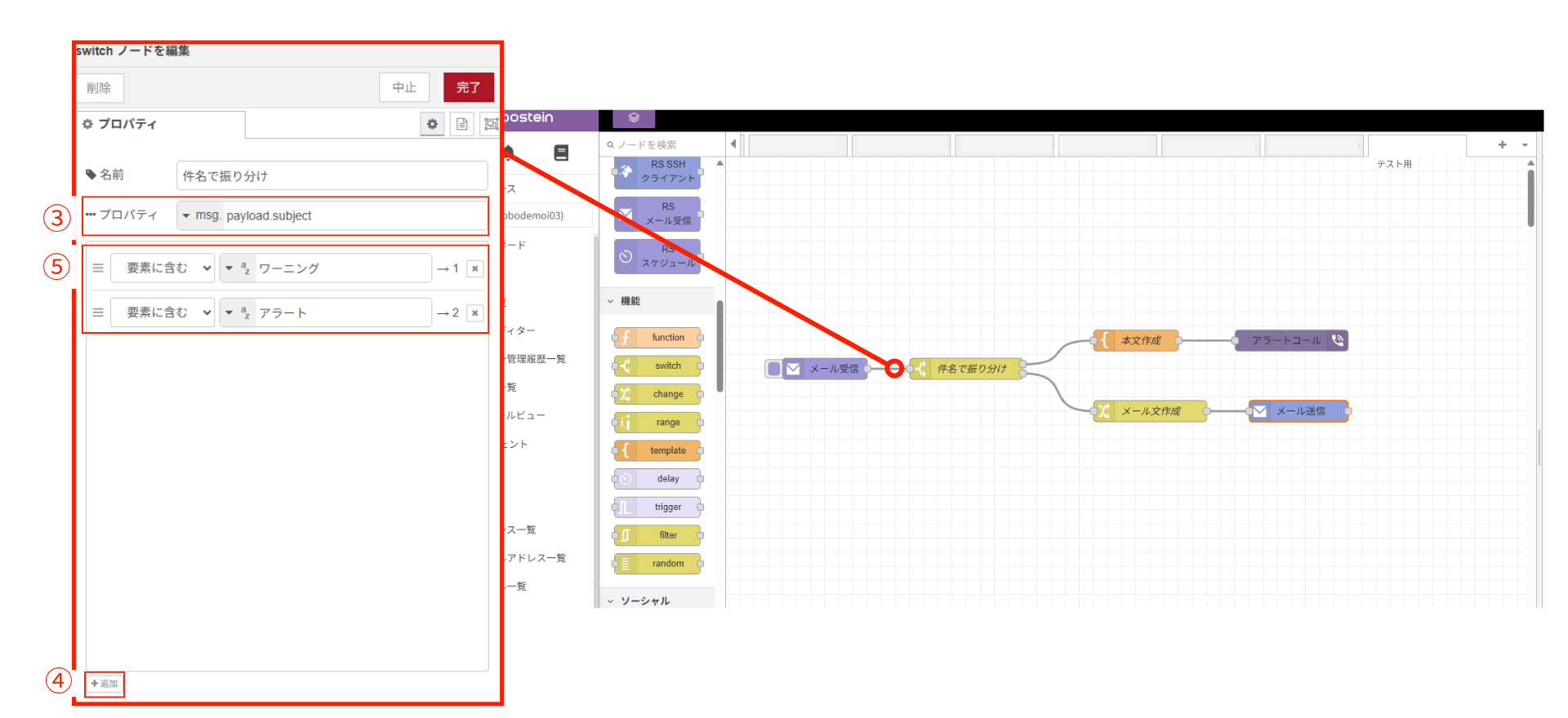 今回は、件名の文言を含むかどうかで振り分けを行うため「要素を含む(contains)」を選択し「ワーニング」→1、「アラート」→2を入力します。(⑤)